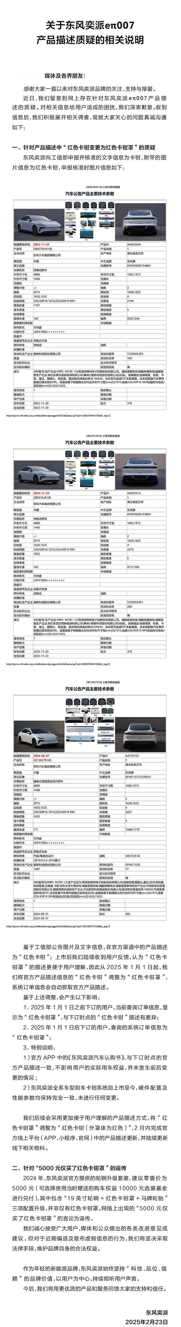 针对“红色卡钳变更为红色卡钳罩”的质疑,东风奕派向工信部申报并核准的文字信息为卡钳,附带图片信息为红色卡钳。